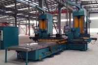 數(shù)控五軸雙立柱鏜床為臥式雙面布置,主要適合加工對(duì)稱度要求高的孔的鏜削加工。并能附帶高速銑削、 低速銑削、鉆孔等功能。工件放在專用移動(dòng)工作臺(tái)上,左右分別兩個(gè)立柱帶可橫向移動(dòng)的滑臺(tái),滑臺(tái)上放動(dòng)力頭。移動(dòng)工作臺(tái)、橫進(jìn)滑臺(tái)及立柱滑臺(tái)由數(shù)控系統(tǒng)控制,主軸轉(zhuǎn)速通過變頻器調(diào)速。該機(jī)床由一套五軸數(shù)控系統(tǒng)控制,配備兩套懸掛式控制箱,并配可持式手脈。機(jī)床配有獨(dú)立的液壓站,能夠?qū)崿F(xiàn)立柱滑臺(tái)的自動(dòng)鎖緊。運(yùn)動(dòng)部分采用滾珠絲杠連接。機(jī)床配有獨(dú)立的電器柜,并有風(fēng)冷裝置。